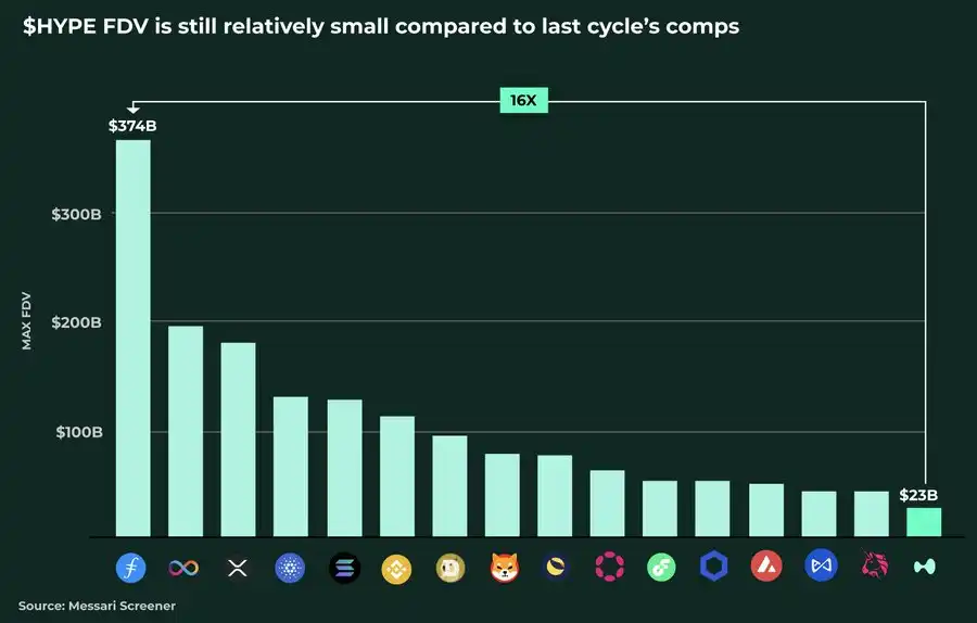在一份旧的Messari 报告中,robustus 曾计算出,对于一个资产,"资本流入倍数"可能高达 10 倍,这意味着 10 亿美元的净流入可能使一个资产的市值增加 100 亿美元。虽然无法准确计算,但考虑到 HYPE 作为第三大最活跃 L1 的潜力,这一点尤为重要。如果 HYPE 能够获得 Solana 市值的 5% 和以太坊市值的 1% 作为流入资金,这将代表 100 亿美元的流入,并对价格产生巨大影响。