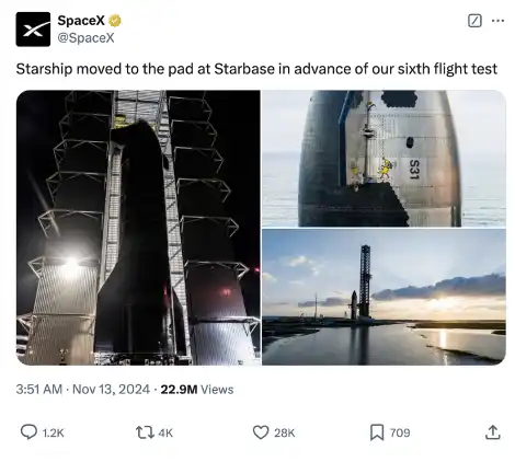 关于 SpaceX 的 Meme 已成为加密行业捕捉和炒作的热点,但此概念的标的大多生命周期较短,直到近期 BANANAS31 的出现,或许有潜力成为第一个科技与文化概念融合的常青 Meme。2024 年 11 月 20 日凌晨 6 时,SpaceX 在德克萨斯州博卡奇卡的发射基地成功进行了星舰 S31 的第六次综合测试飞行。S31 是初代星舰系列的最后一次飞行测试,标志着 SpaceX 将全面转向第二代星舰(Starship V2)的开发。这让 S31 成为整个星舰开发历史中的关键节点。最终的的成功飞行为 SpaceX 挽回了在之前几次失败任务后受到的质疑,展示了星舰系统的逐步成熟,也为其后续的载人任务奠定了信心。S31 是马斯克与 SpaceX 初代星舰的「谢幕任务」和下个宇宙探索计划的开端。