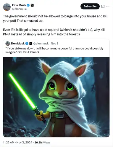 特朗普赢得选举后,PNUT 作为 Meme 已然成为美国自由民主与平权的文化符号,赢得了一场 Meme 文化的胜利。马斯克在大选后发推称「美国是被一只松鼠和 Meme 币拯救的。