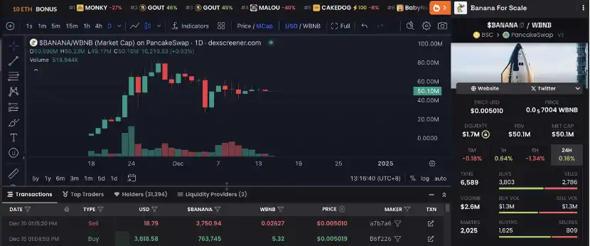 S31 星舰的科技里程碑和幽默的网络梗,让很多 Meme 币有了炒作角度,11 月中有大量关于香蕉,星舰的代币在各链发射,但本次最终跑出的代币不是来自传统 Meme 热点链的 SOL 和 ETH,而来自沉寂多年的 BSC 链。ETH 链的标的均没有很好的价格表现,SOL 链的 BANANA 出现了 为期一周的炒作高光时刻,最高市值达到 6500w 左右,但当前已近似 Rug,令人意外的是 BSC 链的 BANANAS31 生命周期至今已接近一个月,最高市值达到 8000w,当前稳定在 5000w 左右的市值,过往 SpaceX 概念标的生命周期一般为几天时间。而 BANANAS31 同时具有强大的社区在当前还在持续做事,用自己的理解去传播科技与文化 Meme,近日举行「Banana for Scale」Tiktok 挑战赛,甚至进行了 web2 破圈传播。或许该标的或许有潜力成为马斯克与 SpaceX 概念中第一个科技与文化概念融合的常青 Meme。