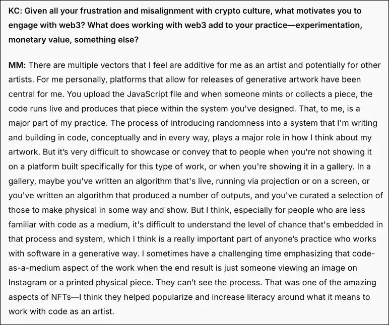 在 2024 年,我们推出了《IN CONVERSATION WITH》,这是一个与音乐、视觉艺术、设计、策展等领域的加密艺术家进行的访谈系列。今年的访谈中我得到的一个关键观察是,许多对加密感兴趣的艺术家通常对前沿技术也有浓厚兴趣,并且希望将这些技术融入到自己的艺术实践中,换句话说,AR/VR 物品、基于代码的艺术和现场编码等。