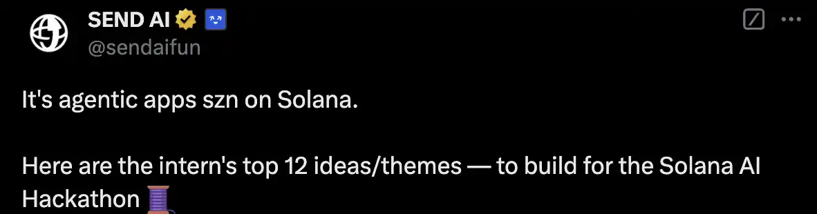 Solana 只要求你能做到上图的任何帮一个环节,这是 Solana 在黑客松的官网 Docs 里描绘的场景,他们想做的其实只有一件事——我们和市场都想要真正的 Onchain Agents。甚至 SEND AI 官方 X 账户再次祭出关于 Agentis App 的 12 个案例,饶有今年年中 SEND 的 X 账户发的 100 个建设 blink 概念的味道。