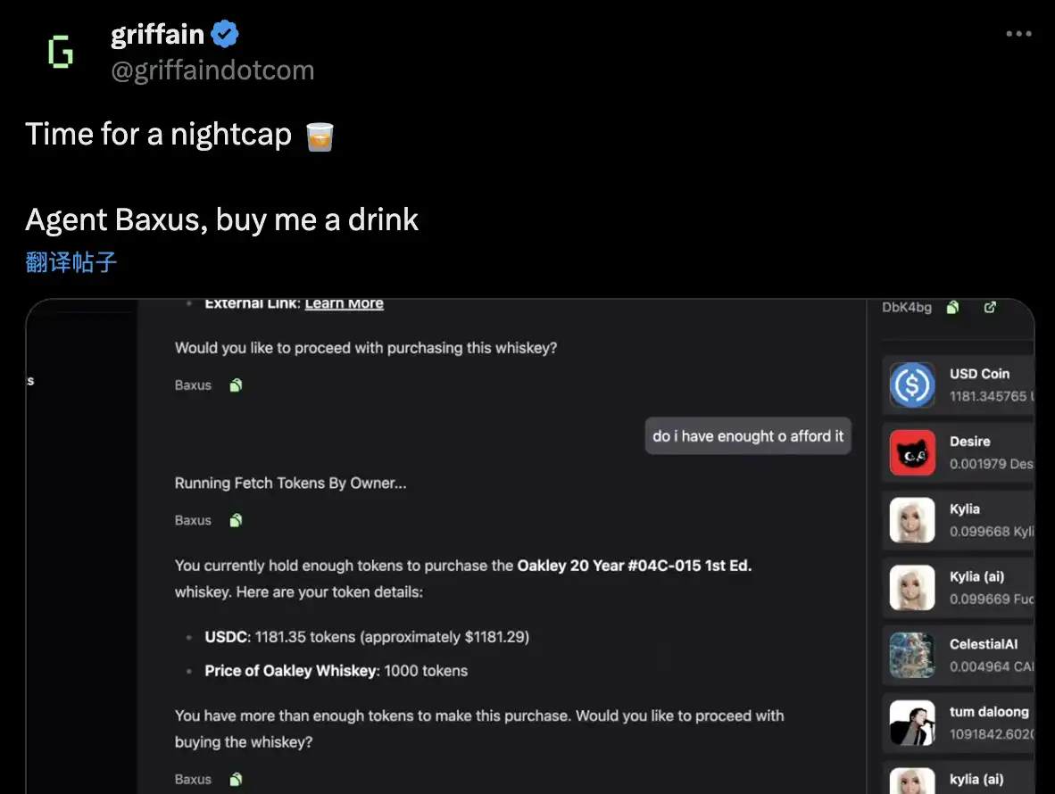 从目前在 X 上分享的几个案例来看,你能够直接用他购买酒,他会调用一个可以使用加密货币等其他支付手段买卖酒的平台「Baxus」(该平台也曾使用 Blink 在 X 上贩售自己平台的酒)来完成用户的需求,全程甚至不用离开和 Griffain 的聊天框。当然不只是酒,你也可以直接跟他商讨要送给他人的圣诞礼物,他也可以为你采购。
