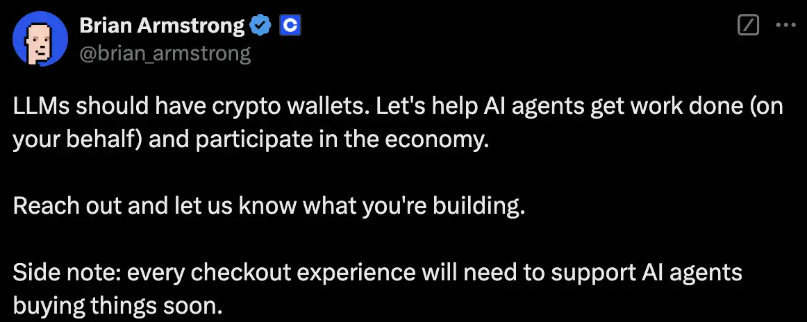 讨论到 AI Agent 就不得不提到 Base,Coinbase CEO Brian Armstrong 在今年年初开始便多次表达对加密货币行业与 AI 结合的强烈信心,AI 的部分发展需要区块链才能承载。例如,传统的银行账户不会支持 AI 使用,如果大模型们(或 AI Agent)都拥有加密货币钱包,他们就能实际打通需求与金融相关层面的问题。
