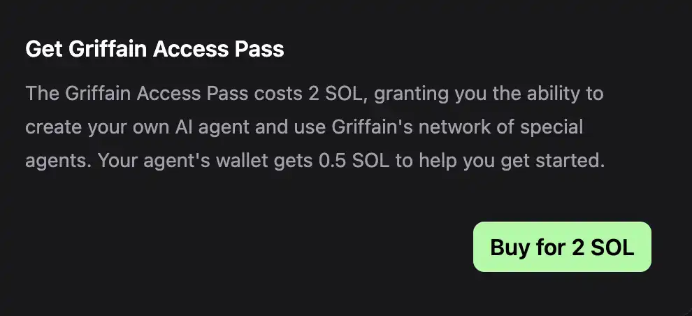 外部人员目前还不支持使用 Griffain,它需要你持有 Solana 手机或是花费 2 SOL 购买 Access Pass,而其中 0.5 SOL 将会保留在你的代理钱包内。虽然市场对其的 FOMO 情绪是来自已经使用过的玩家的用户反馈,尽管整体概念是非常顶级的,但产品在公开后的使用体验才真正决定他是否能成为一个合格的 Agentic APP。