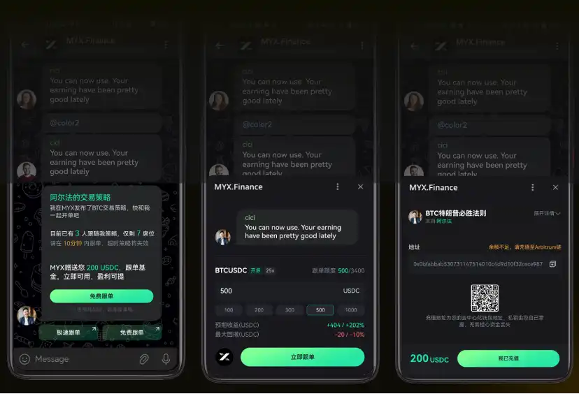 为了进一步加强「增长引擎」的马力,MYX Finance 在上个月上线了 Telegram mini app——目前,Telegram 拥有庞大的 8 亿用户基数,90% 的加密用户都使用 Telegram 进行社交,通过整合「社交 交易」,MYX Finance 的 TG 小程序极大缩减了 Telegram 用户的「交易路径」。用户进入 MYX 小程序后可以通过推特、facebook 等社媒账号或者手机、邮箱登录,自动为用户创建钱包,极大降低了 Telegram 上 Web2 用户的学习成本和使用成本。根据后续公布的产品计划,MYX Finance 将迎来一批交易 KOL 入驻并上线「跟单功能」,真正在链上打通「社交 交易」,用户聊完行情、吹完牛、听完分析或者在 KOL 分享交易策略后,可以一键跟单,紧跟大牛操作。