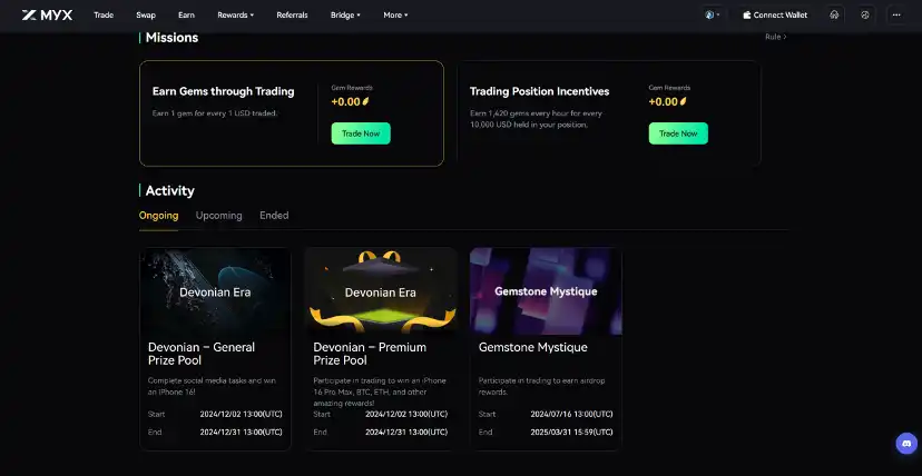 比如 MYX Finance 最大的空投活动「起源计划」,这项计划将 MYX 代币总量的 20% 空投给早期参与者,用户通常只需要完成社媒任务并且正常交易(期间享受极低的交易手续费),就可以赢得空投——目前,已经有近万名用户先后参与了「起源计划」的「寒武纪」、「奥陶纪」、「志留纪」三期活动,虽然不敢确定,但从奖品规模来看,目前正在进行的「泥盆纪」活动是「起源计划」开始以来最大的一期活动,也极有可能是项目 TGE 前的最后一期大型空投活动,羊毛党们如果还没有参与,可以先去完成任务留个空投底仓。