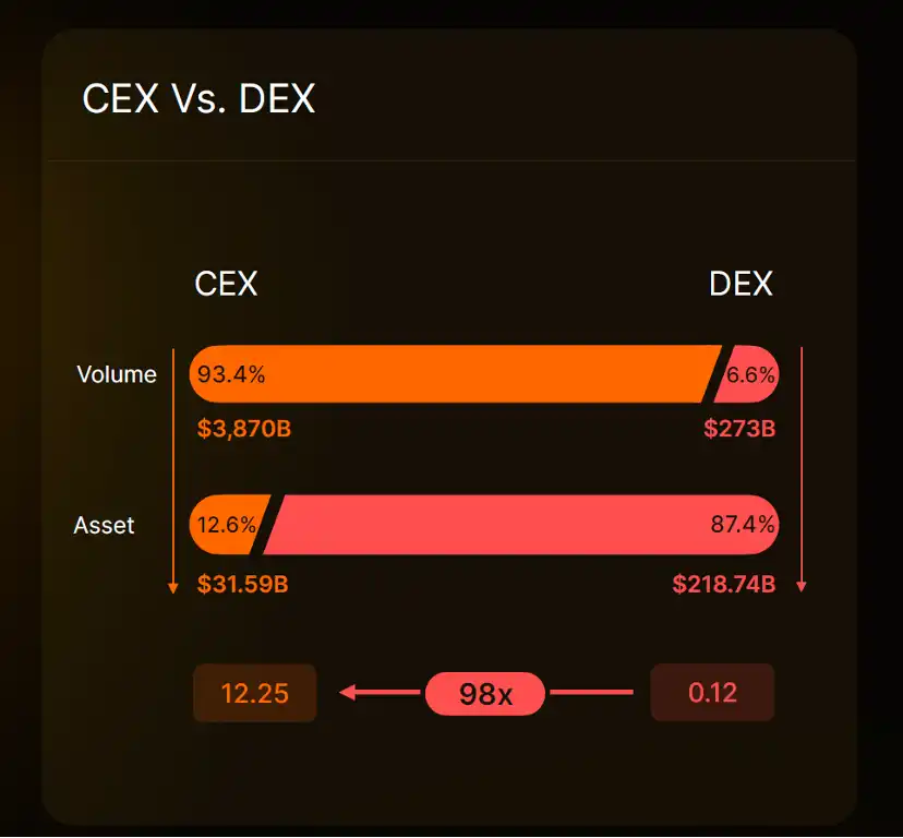 其次,从加密市场的存量资金数据来看,加密用户在 CEX 中的资产约 315.9 亿美元,仅占总资产的 12.6%,而这批用户在 CEX 上的现货月交易量却高达 3.87 万亿美元,占总交易量的 93.4%——与之相对的,加密用户有 2817.4 亿美元存在链上,占加密总资产的 87.4%,但发生在链上的现货月交易量却只有 2730 亿美元,是总交易量占比的 6.6%。资产和交易量的的「错配」,让我们看到,CEX 仍然是加密用户的交易主阵地,而 DEX 更多是处于「试验田」的定位——而如果 DEX 能够在吞吐量、用户体验、可拓展性等方面取得突破,优化用户交易体验,链上资产必然将省去提币至 CEX 交易的冗余步骤,直接在 DEX 进行交易,而去中心化 DEX 就能兑现链上巨量资产的潜在交易市场,迎来一波巨幅增量。