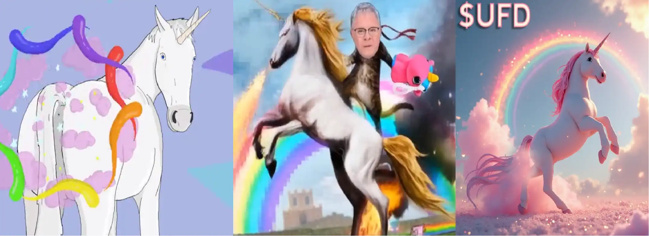 许多人截取了 Ron 放在推特和 YouTube 上的直播视频片段,用 AI 生成他和彩虹屁独角兽的互动,还有各种彩虹屁独角兽的视频、动图、表情包等,他们不断在社交媒体上宣传,表现出对于 UFD 的信心和期待,展示社区的创造力和热情,形成一种信心共识。社区将彩虹屁独角兽的形象与 UFD 的内涵和当下流行的 AI 结合起来,更贴合热点与潮流,推动 UFD 进一步出圈,让更多的人了解并参与到 UFD 交易中来。