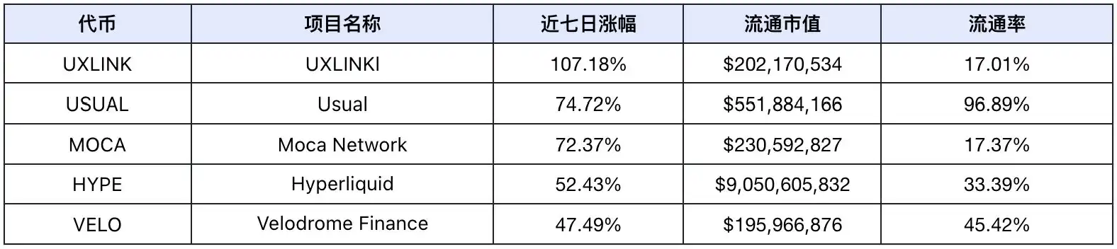 过去一周市场代币涨幅前 5 名(未计入交易量过小的代币和 meme 币),数据来源:Coinmarketcap