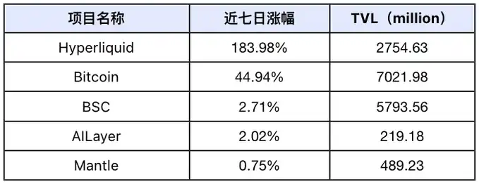 过去一周市场公链 TVL 涨幅前 5 名(未计入 TVL 较小的公链),数据来源:Defilama