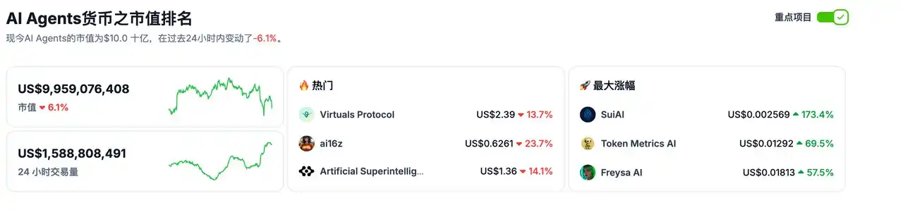 AI Agent 赛道市场规模已达 99 亿美元,投资重心从投机性质的 AI Meme 币转向基础设施建设,这种转变显示出市场正逐步走向成熟,项目方向更趋理性和实用。