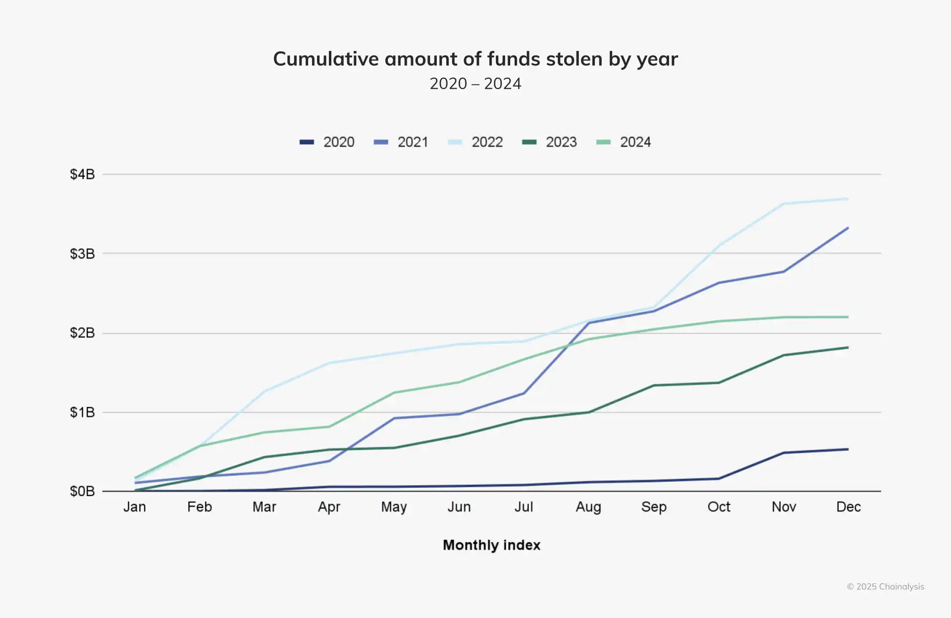 加密货币黑客攻击仍然是一个持续存在的威胁,过去十年中的四年,价值超过 10 亿美元的加密货币被盗(2018 年、2021 年、2022 年和 2023 年)。2024 年是达到这一令人不安的里程碑的第五年,突显出随着加密货币的采用和价格的上涨,可被盗的金额也在增加。