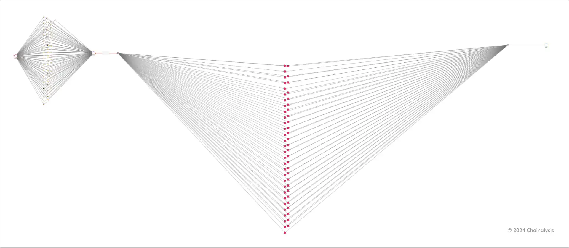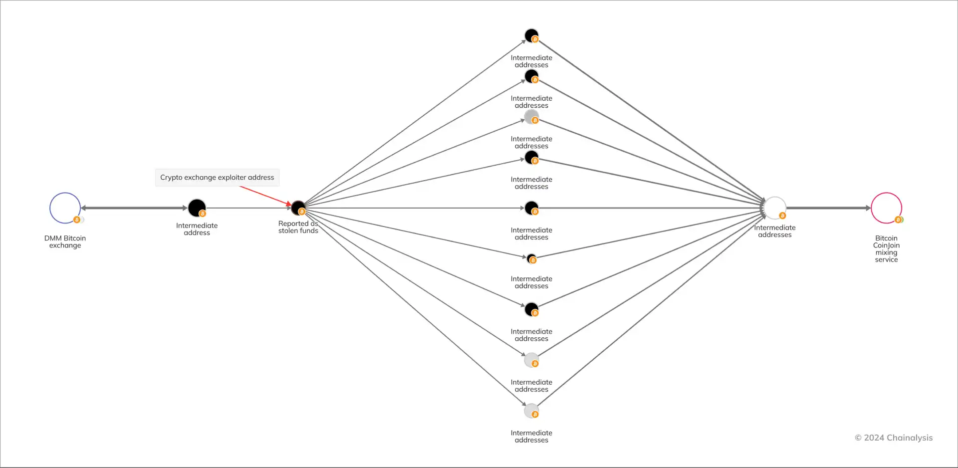 我们能够分析初始攻击后链上的资金流动,在第一阶段,我们看到攻击者将价值数百万美元的加密货币从 DMM Bitcoin 转移到几个中间地址,然后最终到达 Bitcoin CoinJoin 混合服务器。
