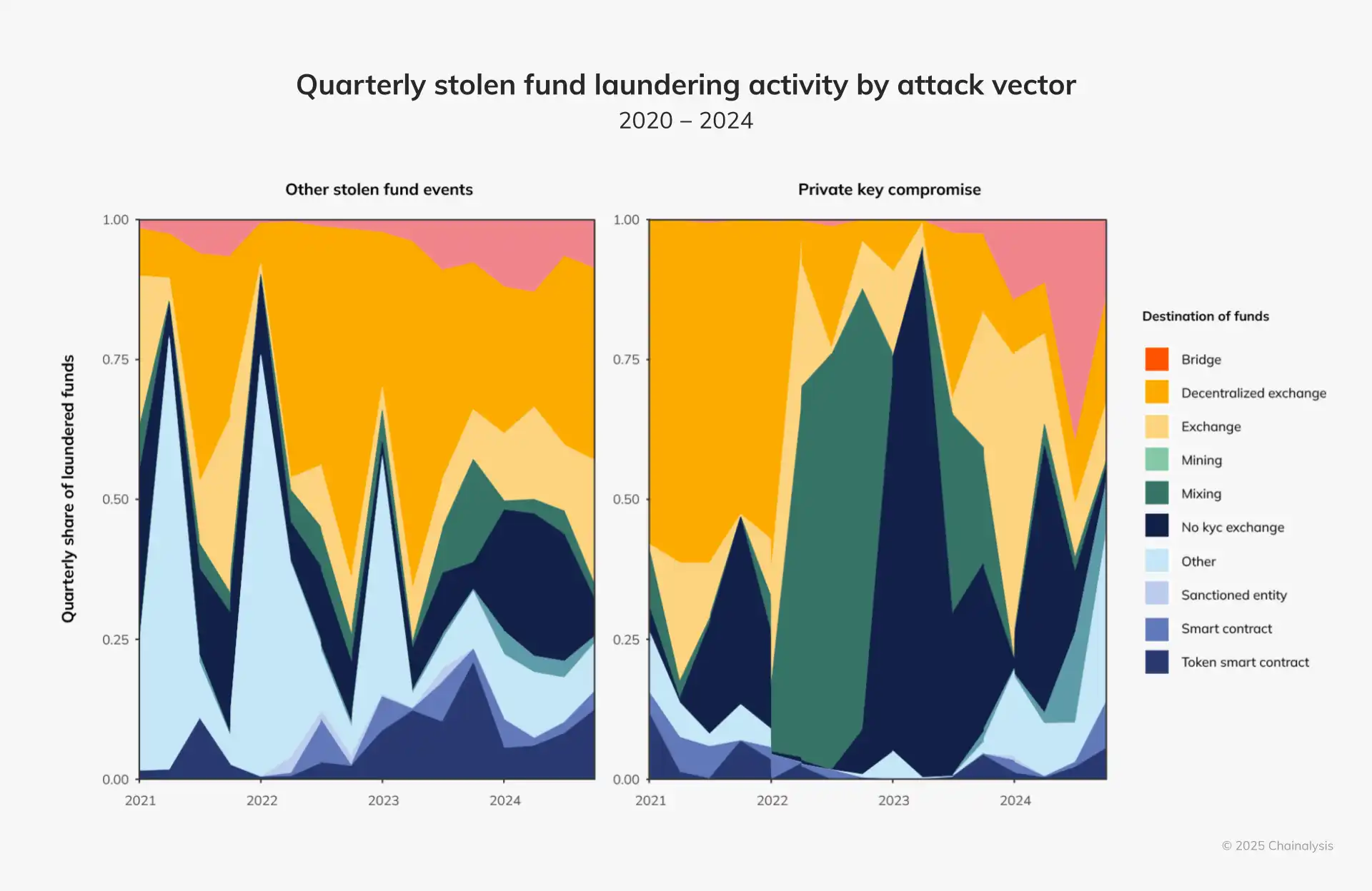在泄露私钥后,恶意行为者通常会通过去中心化交易所 (DEX)、挖矿服务或混合服务来洗钱被盗资金,从而混淆交易轨迹并使追踪复杂化。到 2024 年,我们可以看到私钥黑客的洗钱活动与利用其他攻击媒介的黑客的洗钱活动有很大不同。例如,在窃取私钥后,这些黑客经常转向桥接和混合服务。对于其他攻击媒介,去中心化交易所更常用于洗钱活动。