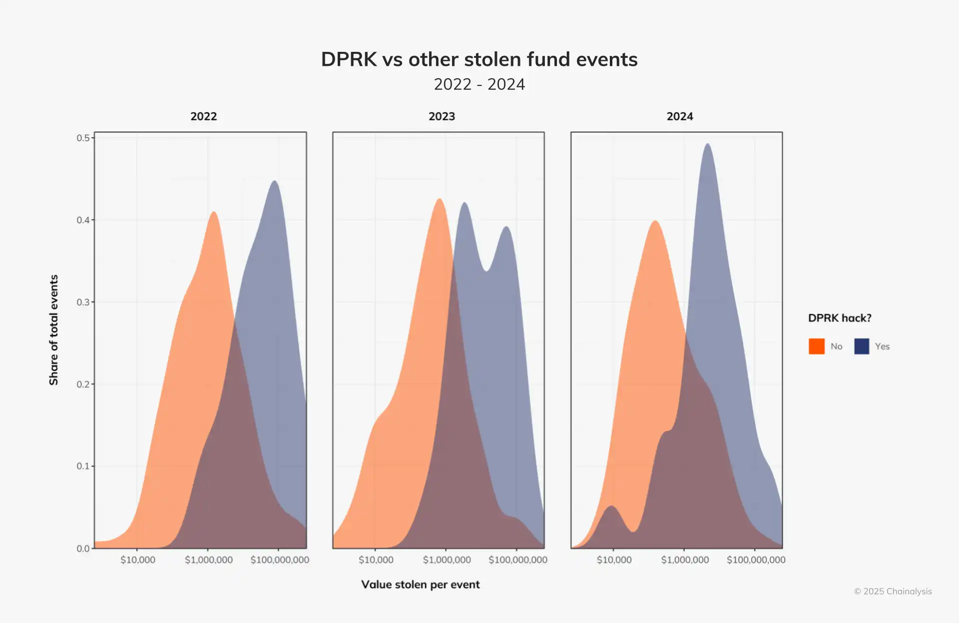 在将朝鲜的活动与我们监测的所有其他黑客活动进行比较时,很明显,朝鲜在过去三年中一直对大多数大规模攻击负有责任。有趣的是,朝鲜黑客攻击的金额较低,尤其是价值 10,000 美元左右的黑客攻击密度也不断增加。