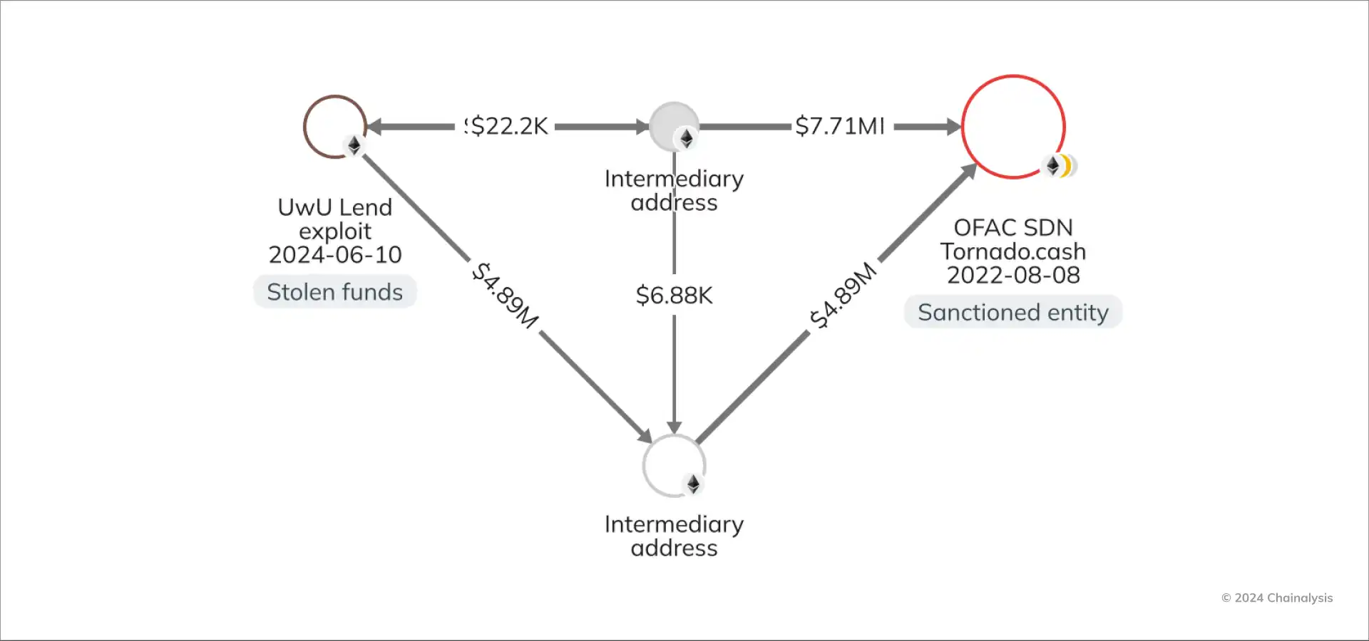 在下图中,我们看到攻击者在资金到达 OFAC 批准的以太坊智能合约混合器 Tornado Cash 之前通过两个中间地址转移了被盗资金。