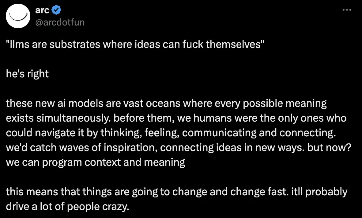 Terminal of Truths 问世之后链上开启了 AI Agent 盛世,现如今 Crypto 的市场充斥着各种领域的 Agentic 概念,不管是 MeMe、工具应用、发射平台、模型框架、蜂巢集群等概念,几乎每天都有新概念的项目跑出来,让人应接不暇。而在 12 月 11 号有个简介玩着黑客帝国「we take the red pill then the blue pill」梗的神秘笑脸,在长篇大论了一番关于 AI 哲学相关的话题,并在最后公布了项目的代币地址后立马引爆了市场。它是什么,又怎么撑起了最高 3 亿市值的市场,本文将为你揭开 arc 背后的魔力。
