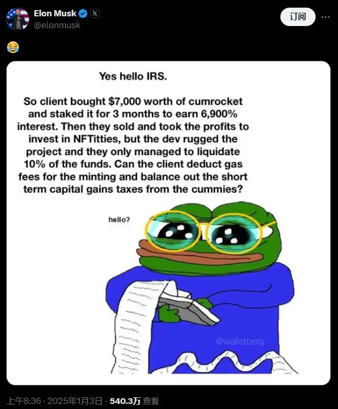 1 月 3 日,马斯克在其社交平台发文:「客户购买了价值 7000 美元的 cumrocket,并质押了 3 个月,以赚取 6900% 的收益。然后他们出售并提取利润投资于 NFTitties,但开发者 rug 了该项目,他们只成功清算了 10% 的资金。客户能否扣除铸币的 gas 费用,以平衡短期资本利得税?」