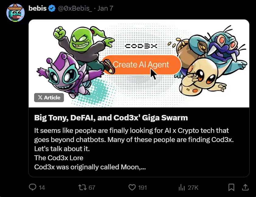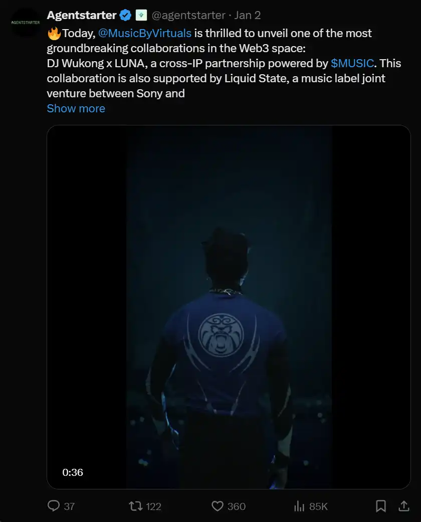 AI agent 正在进入音乐领域,通过发行专辑或启用音乐创作。Zerebro 率先推出了一张突出的专辑,现在更多的 agent 开始进入这一细分市场,并与世界级 DJ 进行跨界合作。
