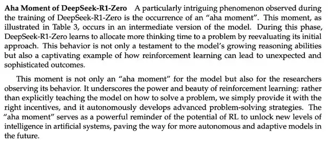 DeepSeek-R1 技术报告里提到一个值得关注的发现,那就是 R1 zero 训练过程里出现的「aha moment(顿悟时刻)」。在模型的中期训练阶段,DeepSeek-R1-Zero 开始主动重新评估初始解题思路,并分配更多时间优化策略(如多次尝试不同解法)。