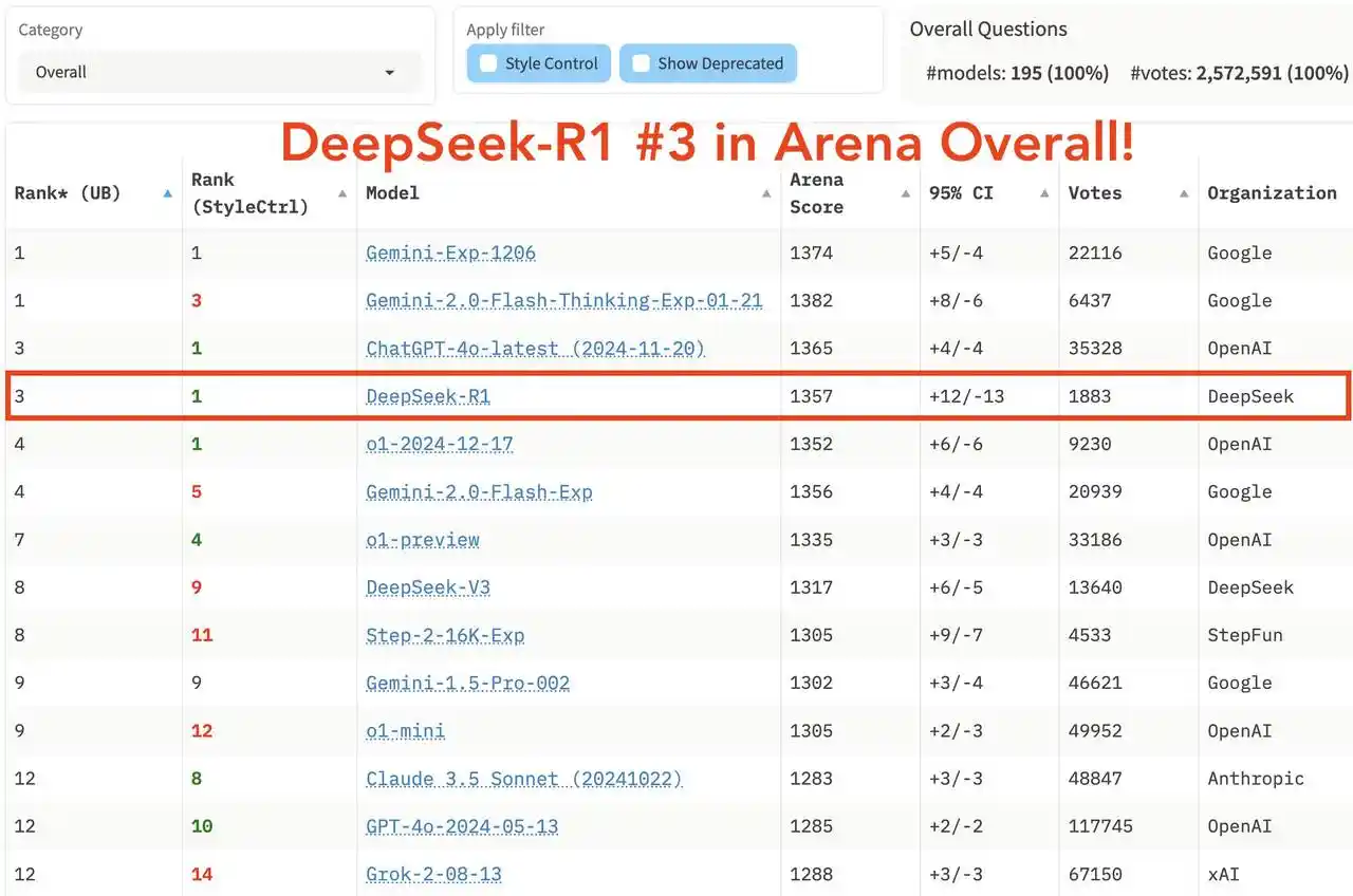 在最新公布的大模型竞技场 LM Arena 的综合榜单中,DeepSeek R1 排名第三,与 o1 并列。
