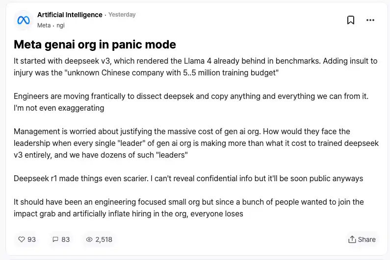 来自竞争对手的反应或许是对 DeepSeek 最好的认可。据 Meta 员工在匿名职场社区 TeamBlind 上的爆料,DeepSeek-V3 和 R1 的出现让 Meta 的生成式 AI 团队陷入了恐慌。