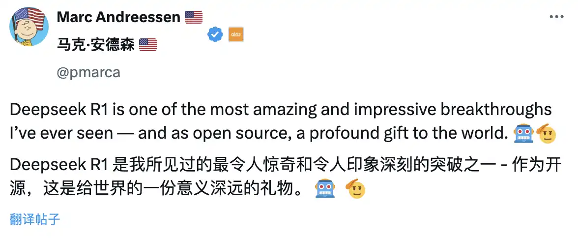 华尔街顶级风投 A16Z 创始人 Marc Andreesen 则认为 DeepSeek R1 是他所见过的最令人惊奇和令人印象深刻的突破之一,作为开源,这是给世界的一份意义深远的礼物。