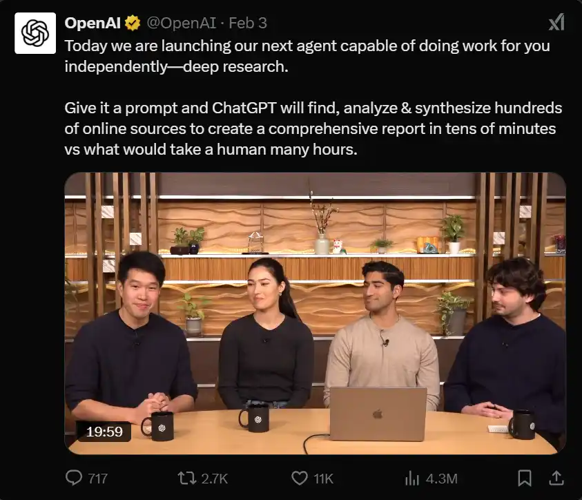2 月 3 日—OpenAI 通过推出升级版 agent(Deep Research)回应 Qwen 和 Deepseek,进一步提升 agent 输出,尤其是在 Deepseek 获得市场份额之后。