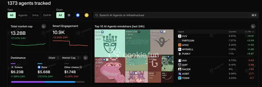 这是在 Cookie 上新增了 14 个 agent(增长了 1%),不过整体市值下降了 56 亿美元(下降了 42%)(下方为上周数据,供参考):