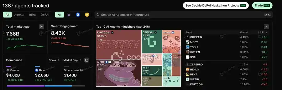 至于当前的 AI agent 与加密市场:CookieDOTFUN 记录了 1,387 个 AI agent,总市值达到了 77 亿美元。