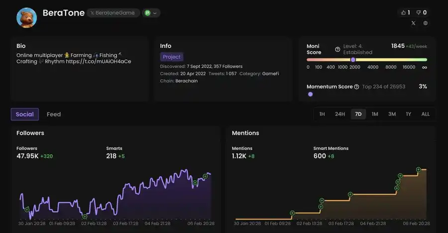 Beratone 是一个在线 P2E(玩赚)农业和钓鱼模拟游戏,适用于 PC 和移动设备。该游戏灵感来源于 Stardew Valley 和 Animal Crossing,提供玩家探索世界、管理农场、收集资源、定制家园和与其他玩家互动的机会。该团队的目标是吸引那些可能不熟悉加密货币的休闲玩家。游戏集成了区块链机制,允许玩家赚取稀有的游戏内物品并进行交易。