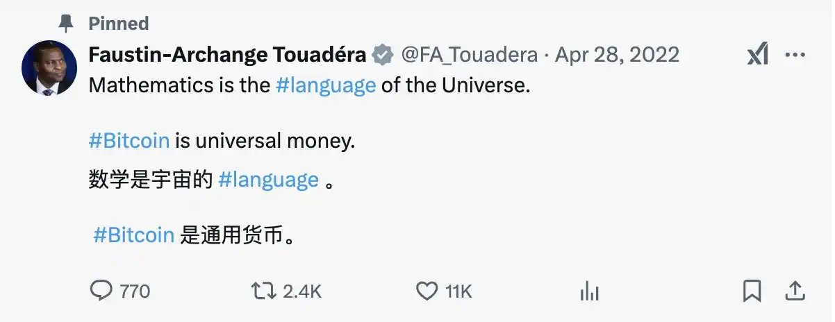 无论如何,加密货币主流化的进程还将以类似的代币风波与 ETF 基金等奇正相辅的途径继续,每个人既是参与者,也是见证者。正如中非总统 Faustin-Archange Touadéra X 平台官方账号置顶推文说的那样:「比特币是通用货币」。