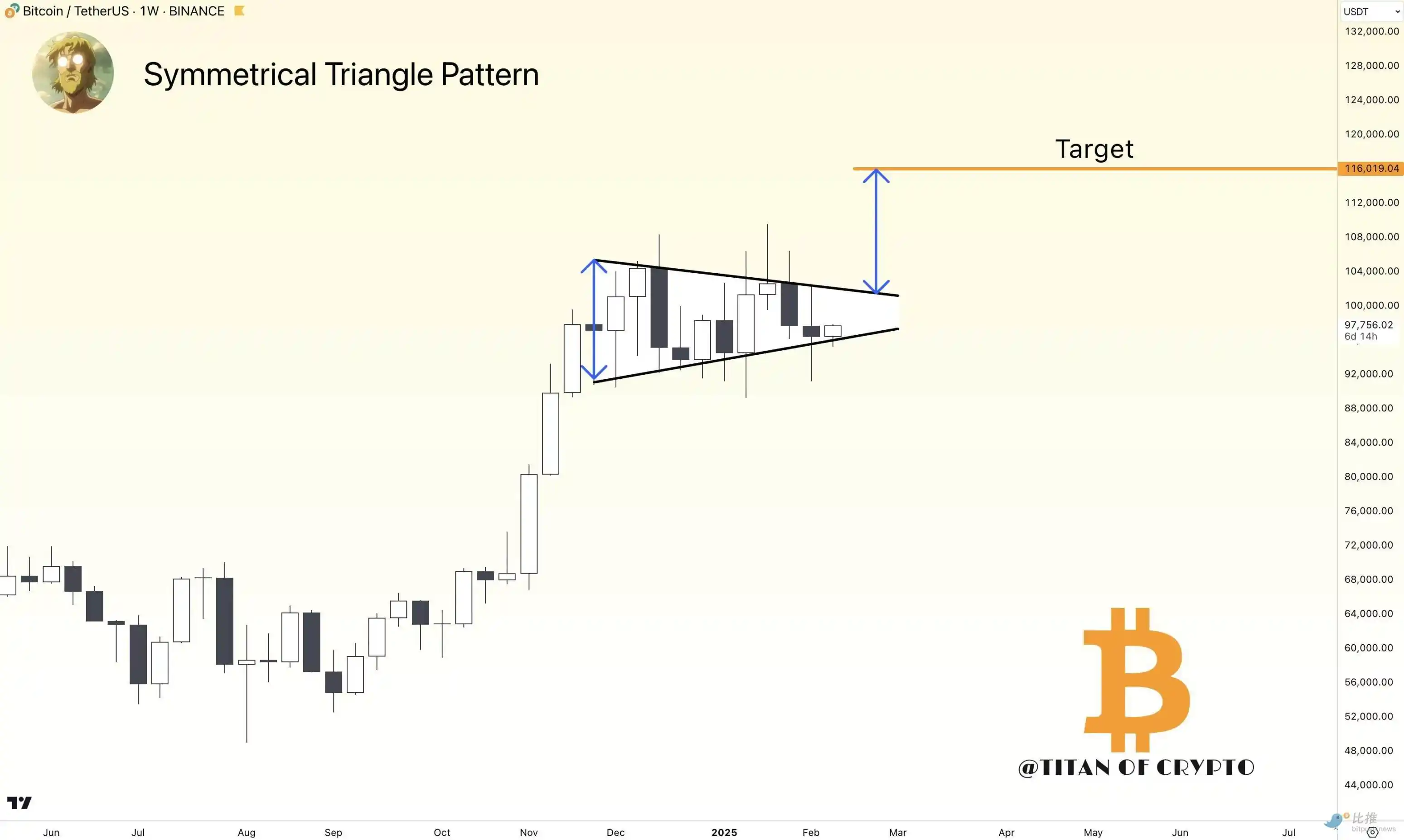 市场分析师 Titan of Crypto 指出,比特币价格有望突破三角形的上趋势线,并最终达到 116, 000 美元的目标位。根据技术分析规则,上涨目标位的计算方式是将三角形上下趋势线之间的最大距离与潜在突破点相加,这一方法为比特币的上涨目标提供了理论依据。