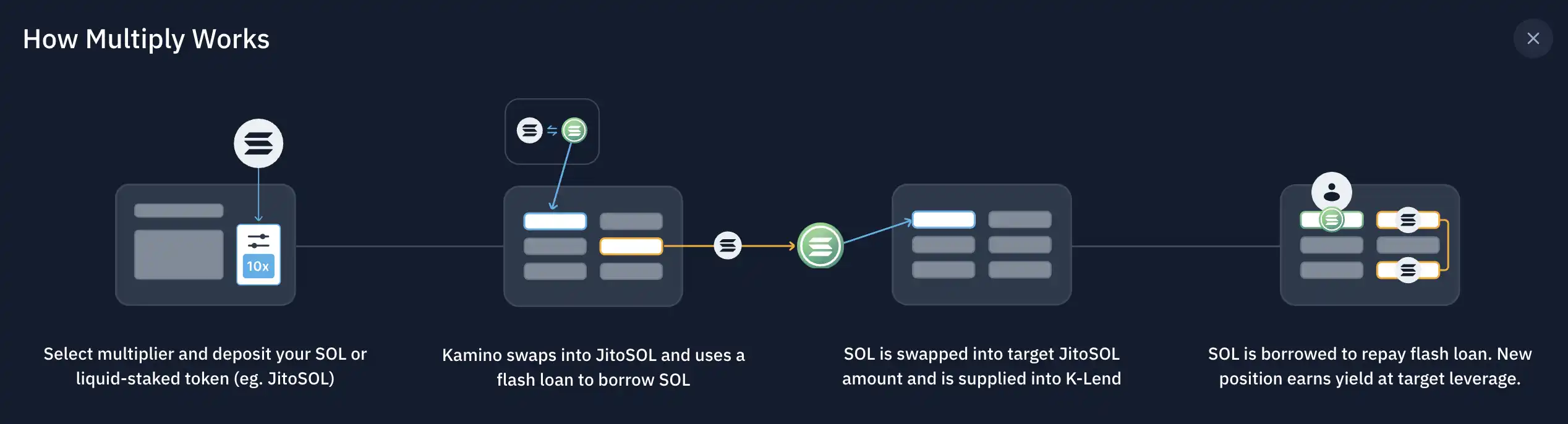 举例来说,用户选择希望使用的杠杆倍数并存入资产,比如 SOL 或 JitoSOL,协议层面 Kamino 自动将用户存入的 SOL 兑换为 JitoSOL。为了进一步放大用户的资金使用效率,Kamino 还会通过闪电贷借入 SOL。Kamino 将借入的 SOL 兑换为更多 JitoSOL,然后将这些 JitoSOL 存入 Kamino 的借贷平台 K-Lend,随后,Kamino 从 K-Lend 中借入 SOL,用于偿还之前的闪电贷。