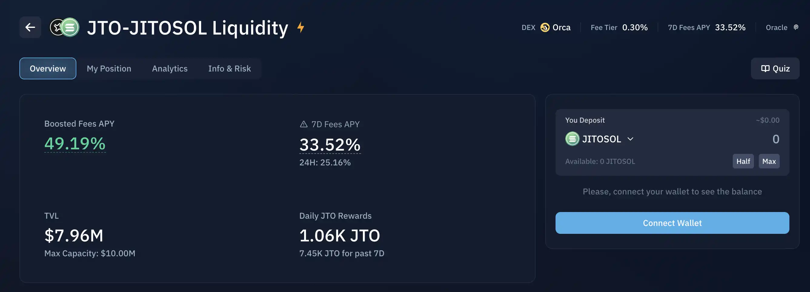 比如以 JTO-JITOSOL 金库为例,自 1 月 6 日开始,75,000 枚 JTO 通过 Kamino 分发给存款用户作为激励,这些奖励将按照与其他 Kamino 农场相同的方式分配,与 TVL 成比例。例如,如果你在接下来的 30 天内占金库的 10%,就可以获得 10% 的 JTO 奖励。