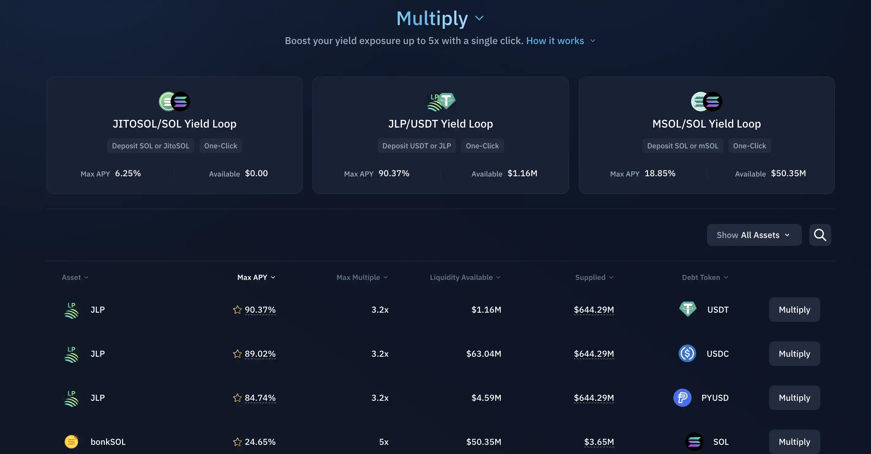 如果你有闲置的 USDT,低风险的参与方式可以选择在 Kamino 的借贷市场中提供 USDT,目前 Main Market 和 JLP Market 中 USDT 的 APY 分别为 6% 和 5%,但你也可以选择将 USDT 投入 Kamino 的王牌产品 Multiply 模块中,最高 APY 可达 90%。