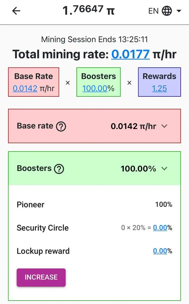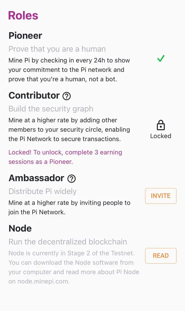- 贡献者需要通过挖矿 3 天解锁,并且通过添加已有 Pi 用户或手机联系人用户的方式,建立「安全圈」。建立后可以获得额外的挖矿算力,每个人加 0.02,最多奖励 0.1(5 人)。
