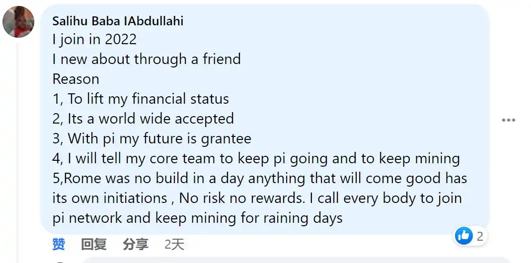 再加上团队斯坦福博士后的身份,整个叙事就变得非常地「合理」。上周,我在各个 Pi 的 FB、Telegram、Reddit 社区发起调查问卷,超过 70 位受访者在被问到「举出三个你相信 Pi 价值并持续使用的理由」时,超过 75% 的受访者回答中列举了「全球广泛应用」,多人在回答中举出 BTC 发展历程的例子,描述 Pi 目前的进程。