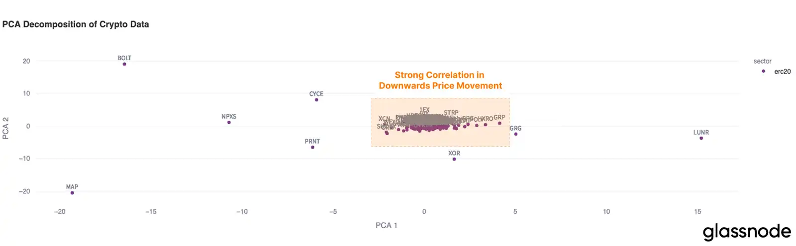 为了探索山寨币领域的下行价格走势,我们可以利用主成分分析 (PCA),将代币回报的相关性投射到二维空间中。这种可视化有助于根据代币的回报行为识别表现相似(聚集在一起)或不同(相距甚远)的代币。