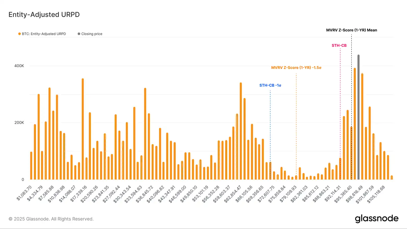 当将价格轨迹叠加到 URPD 成交量分布图上时,捍卫 STH 成本基础和 MVRV 1Yr Z-Score 定价区域的重要性变得越来越明显。在这些水平以下可以看到显著的成交量空洞,在这个价格范围内很少有代币易手。