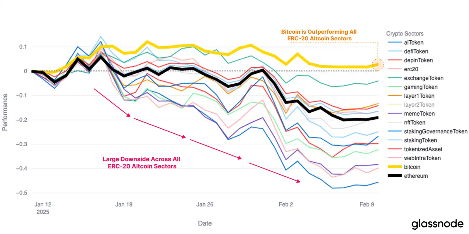 另一方面,山寨币行业经历了巨大的卖方压力,许多资产难以实现广泛采用或产品与市场的契合,这使得市场环境更加严峻。这最终导致代币价格大幅下跌,最近几周所有山寨币子行业的表现都不如比特币。