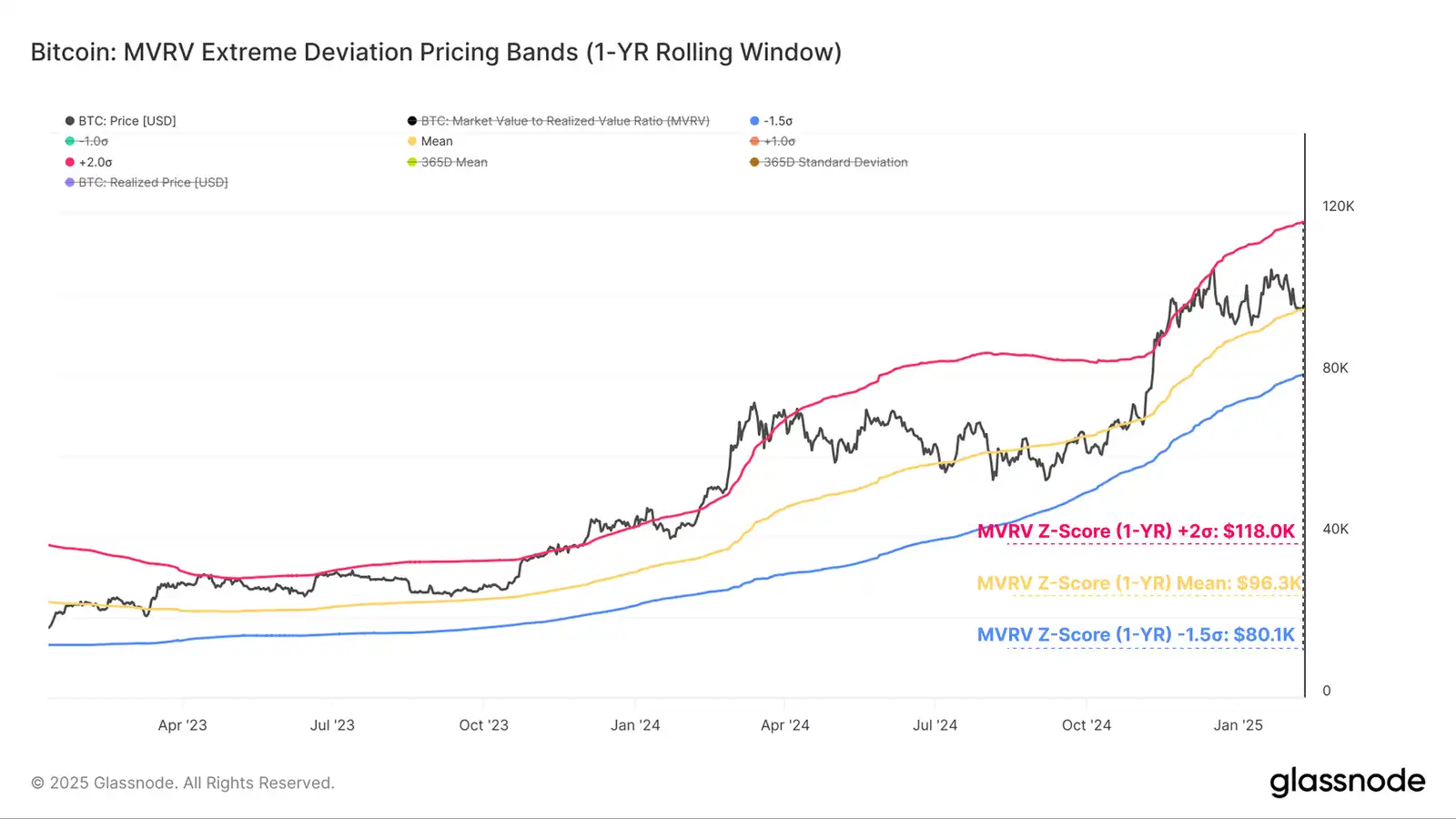 为了评估关键支撑领域,我们可以在 1 年滚动窗口上使用 MVRV Z 分数。这种特定的转换可以更清楚地表示近期的市场动态,模型仅捕捉近期的市场行为。