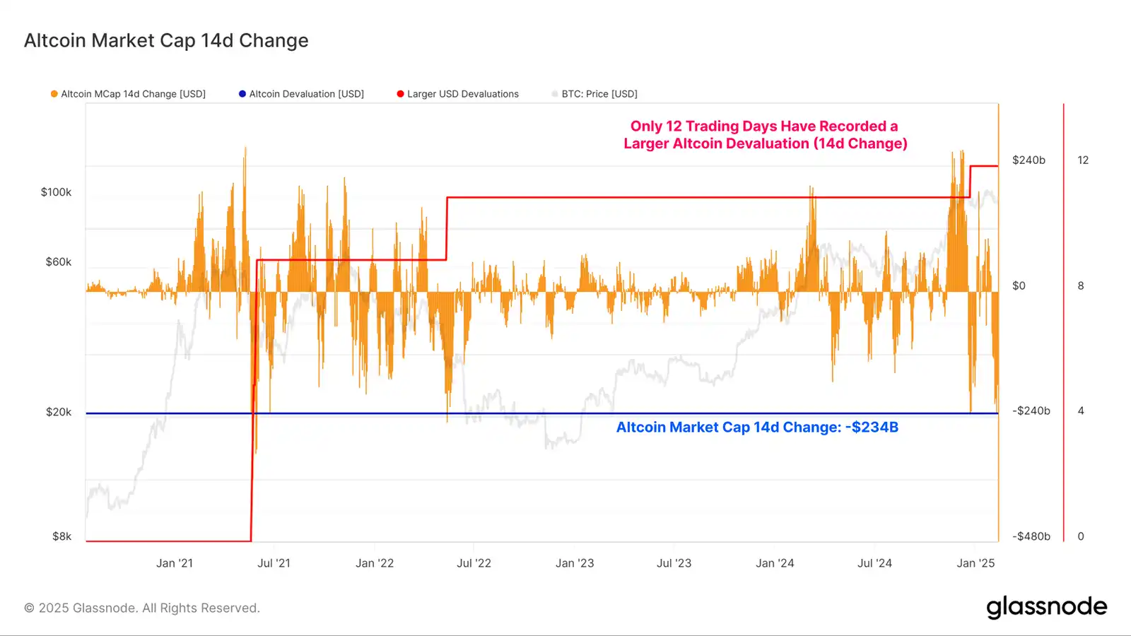 我们可以通过评估全球山寨币市值 14 天的变化来评估下跌的幅度。在过去两周内,山寨币市值下跌了 2340 亿美元,少数几天的绝对下跌幅度更大。
