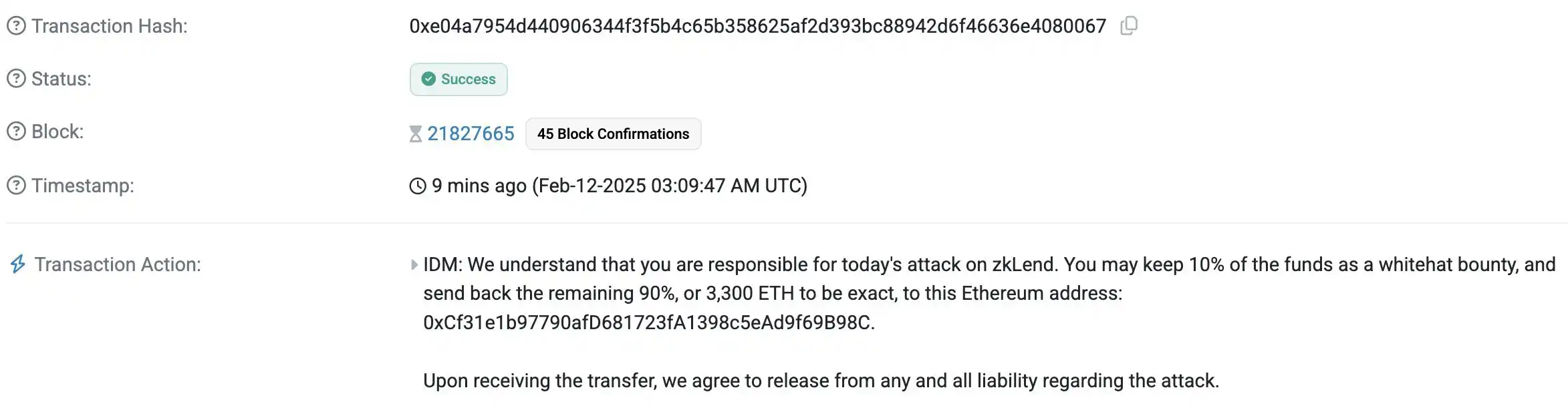 事件发生后,zkLend 为保障剩余资金安全暂停了提款服务,并发文向社区表示团队正在与多个合作方积极追踪黑客身份和资金流向,承诺保持透明,最终会发布详细的调查分析报告。此外,zkLend 还对黑客提出可以保留 10% 的资金作为白帽赏金,将剩余的 90%(3,300 枚 ETH)转回至 zklend 的以太坊地址。收到转账后,将同意免除与攻击有关的任何和所有责任。