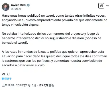 11 点 38 分,阿根廷总统 Javier Milei 在社交媒体上发文表示,自己几个小时前发布的推文,本来以为和以往一样,只是随意支持一下一个与自己无关的私人创业项目。自己对该项目的细节并不清楚,在了解后绝对不再进行传播(这也是删除推文的原因),对于想利用这种情况来害人的肮脏老鼠,他们每天都在证实政客们有多么卑劣,这更加坚定了决心要将你们一脚踢开的信念。