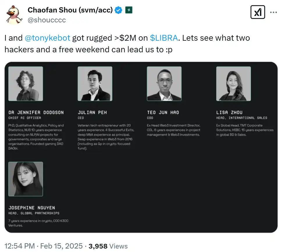 12 点 54 分,Solayer 创始人 Chaofan Shou 在社交媒体上发文表示,自己和 Solayer 工程师 @tonykebot 在 LIBRA 上亏损超 200 万美元,配图发布了 LIBRA 背后团队 KIP Protocol 的核心成员名单,并配文「让我们看看两个黑客和一个空闲周末能给我们带来什么」。
