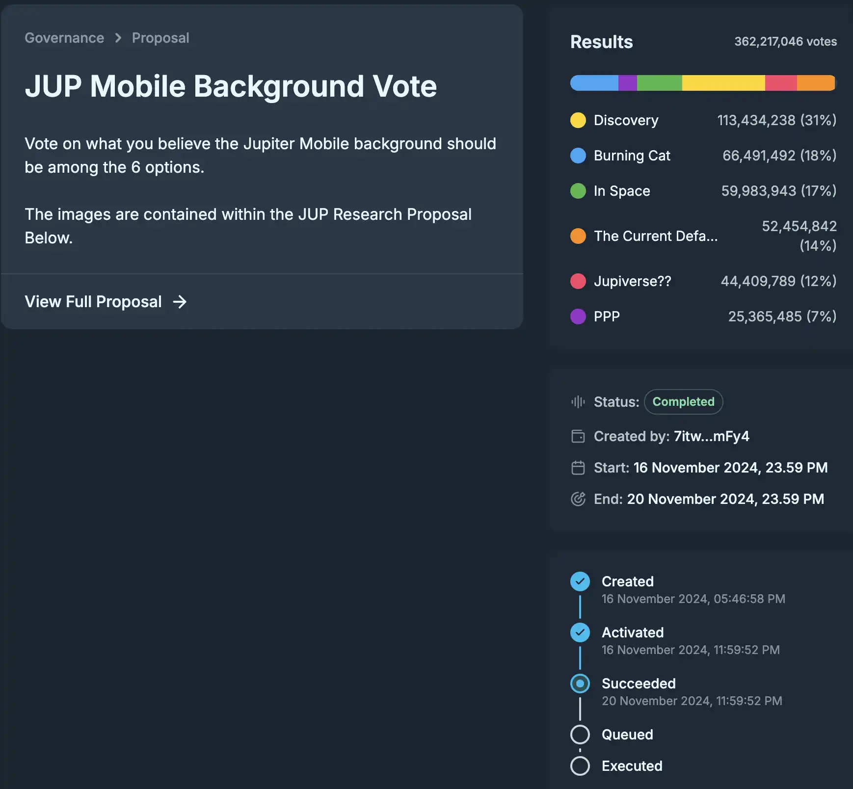 在社区治理方面,Jupiter 通过 DAO 机制「vote.jup」,允许成员参与代币分配和项目决策。小到移动 APP 的背景,大到项目代币的使用都由社区共同决定。例如,Uplink 工作组的预算提案投票率超过 50%,大部分提案的通过票占比超过 70%,弃权票维持在 15% 以下,体现了社区成员对项目发展的积极参与和支持。