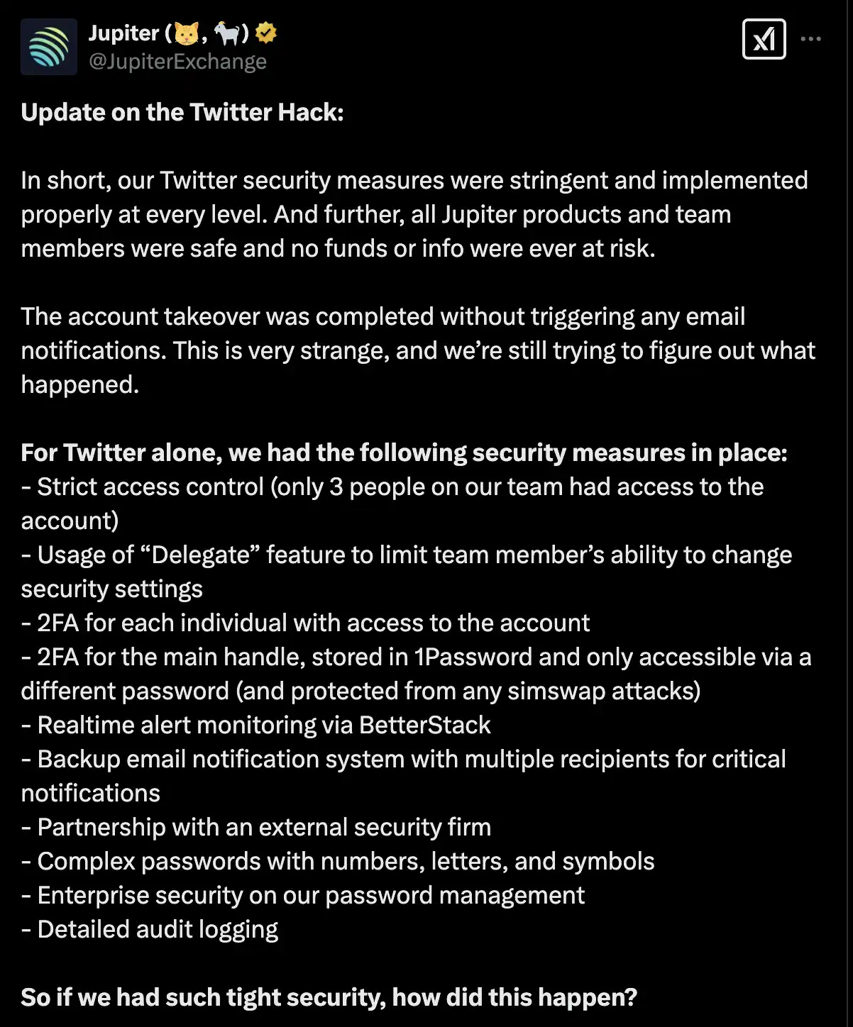 以这次推特被盗为例,在一大早官推发出 CA 后,Jupiter 便迅速反应开始了和黑客的发推删推的拉锯战。而后在查出登陆 IP 可能是因家事从美国返回新加坡的员工手机上时,联想到近期发生的多起加密货币从业者被绑架案,Meow 首先在推特上发表了自己的担忧,在验证一切无事后。Jupiter 也在推特公布了完整的调查报告,并向社区表示资产的安全以及该起事件并不是由项目方的失误而起。这种负责的处理方式也让他们在这起事件中并没有收到多大的舆论影响。在这个缺乏监管、即使「假装」被盗号发 CA 也不会有人深究的行业里,这种负责任的处理方式确实值得某些个人和项目方学习。