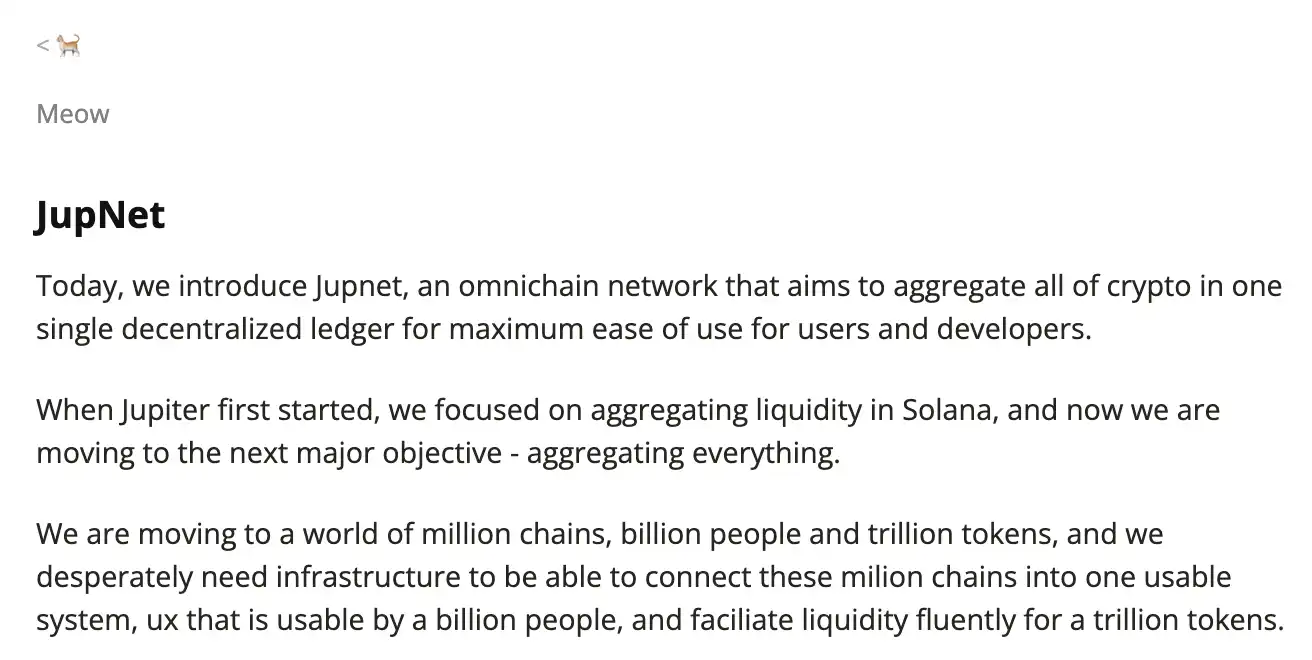 就在完成 Trump 发射后的几日,除了公布对 Moonshot 完成的大部分股份收购,还公布了一个全链网络 Jupnet,通过 Dove「去中心化预言机」和 Omnichain 分布式账本网络,在将所有所有链上的加密货币聚合到一个去中心化的账本中,以最大化用户和开发者的使用便利。同时推出 ADI「聚合去中心化身份」,其描述的完全链上身份和认证系统将改变 Crypto 使用钱包进行交互的体验,将 UX 和 DX 整合回用户熟悉的账户界面。